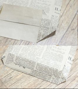 Bước 1: Bạn cắt tờ giấy gói quà (hay giấy báo)thành hình chữ nhật, sau đó gập làm 3 và để hai bên mép đè lên nhau thành hình dạng một chiếc túi như hình dưới.