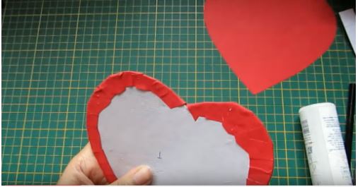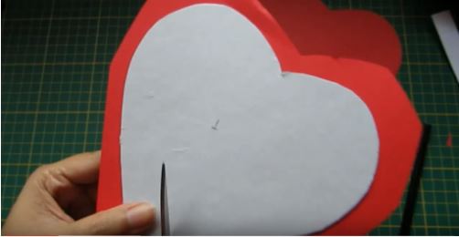 Sau đó dán bìa trái tim lên trên trái tim đỏ, sau đó cắt tua rua mép thừa phía ngoài của trái tim đỏ