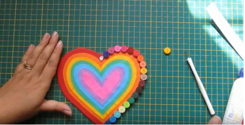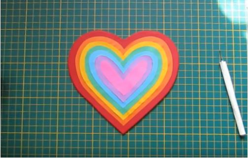 Các bạn tiếp tục cắt các hình trái tim với các màu sắc khác nhau theo thứ tự nhỏ dần và dán lần lượt lên trái tim màu đỏ nhé.